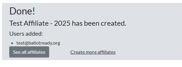 NOTE: Sometimes an affiliate already exists in the BallotReady system, and you’ll receive an error message that says Could not create organization Example Affiliate 1: Name has already been taken. If this happens, reach out to your Customer Success Lead for help connecting the affiliate to your account.