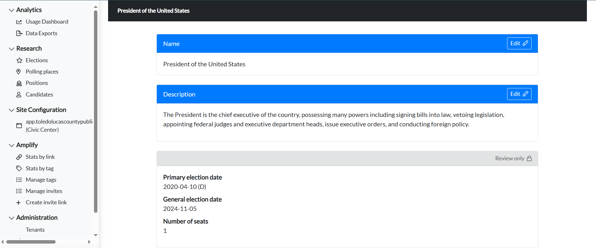 In the Elections tab, you can search for candidates and positions to make customizations using markdown to candidate pages like adding biographical information, adding videos or photos, or adding news articles.