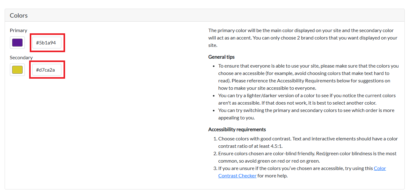 - Update the codes under "Primary" and "Secondary" to your brand colors