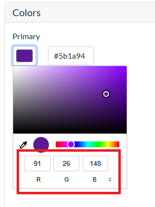 You can update the colors of your website through 3 different methods: HEX code, RGB code, or manually selecting a color. You can use this site to convert your brand colors into HEX or RGB codes.