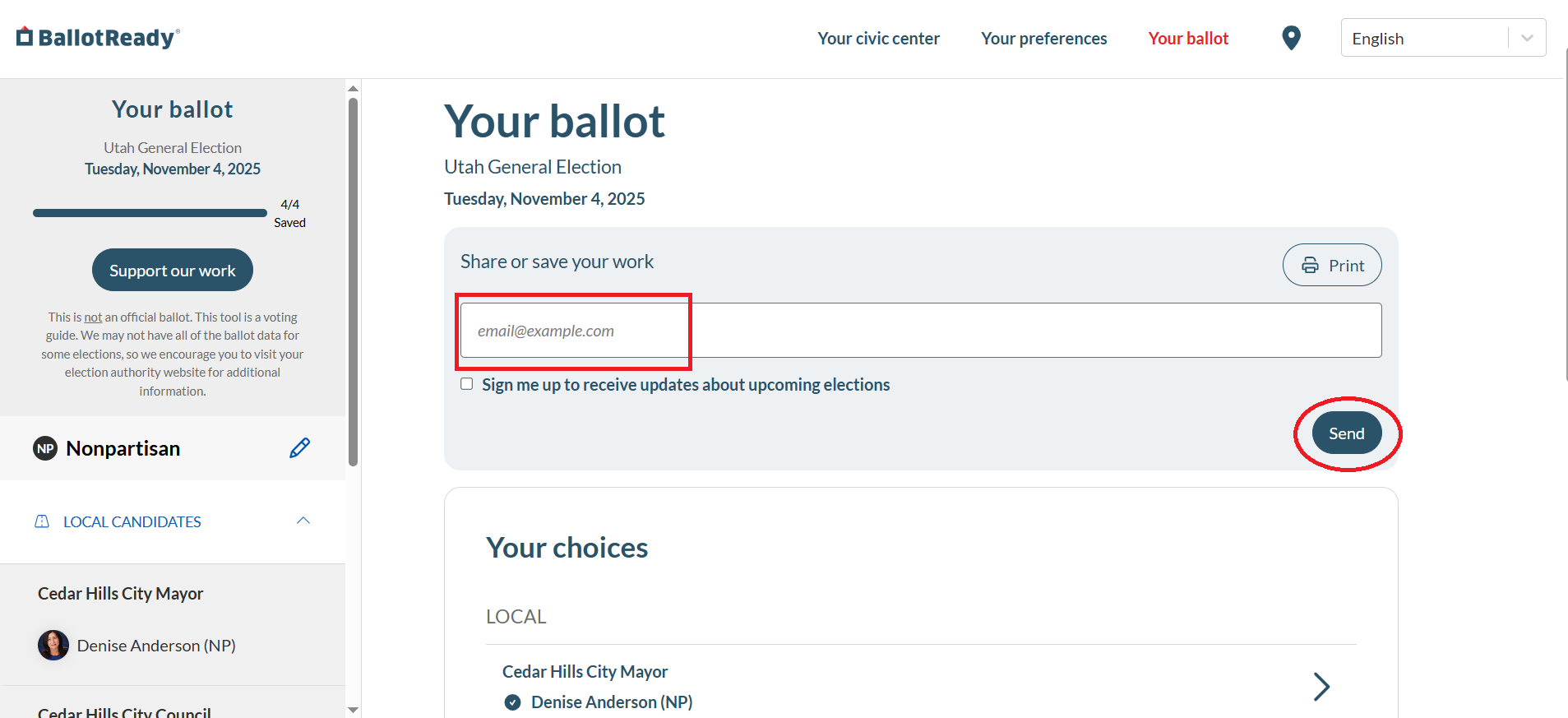 You will get an overview of the candidates and/or ballot measures you’ve selected before printing. Look over your selections to make sure all choices you made are reflected. Once you've done that, enter your email address and click "Send".